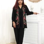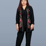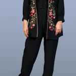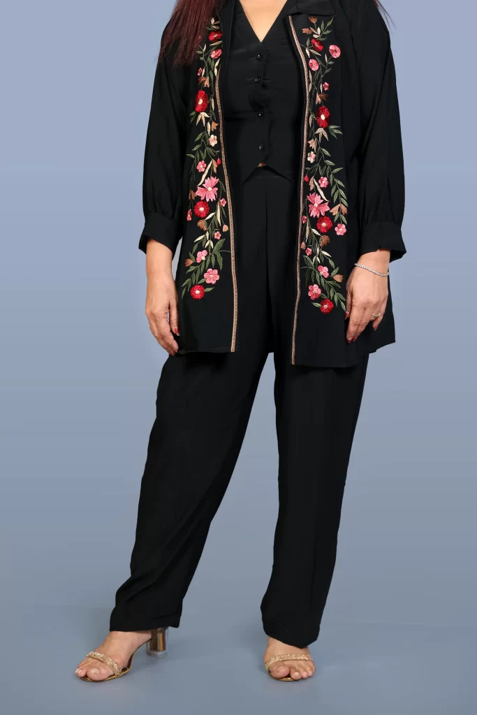 (20% OFF)Black 3 piece Coord Set with sleeveless top, Pants and Jacket. The jacket is detailed with vibrant floral embroidery adding a graceful and elegant touch.