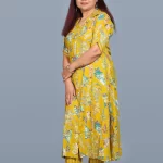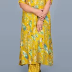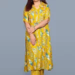 Stylish Mustard floral printed A Line Kurta set with slit on the shirt paired with pants