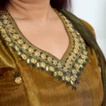 (20% OFF)Olive Green Straight Kurta set with elegant mirror detailing on neckline and peacock print on Kurta and Dupatta.
