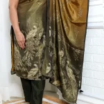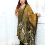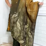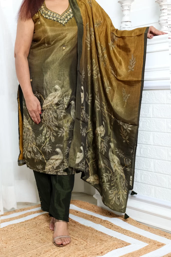 Olive green Peacock print Kurta set with matching pants and Dupatta