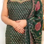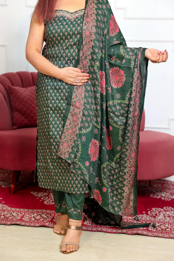 Bottle green Straight Kurta Set with elegant embroidery on neckline, paired with printed dupatta and matching pants. Comes with separate Sleeves.