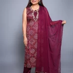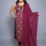 (20% OFF)Wine colour Bandhni print Sytraight Kurta Set with beautiful embroidery on the neckline paired with matching pants and Dupatta