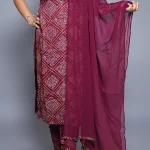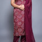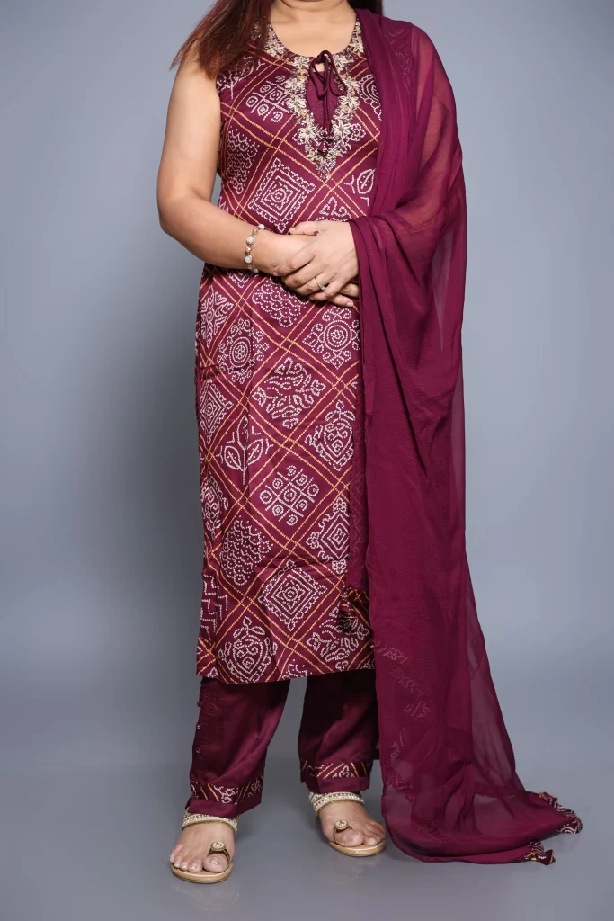 Wine colour Bandhni Print Kurta Set with Embroidered Neckline